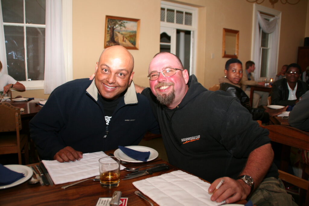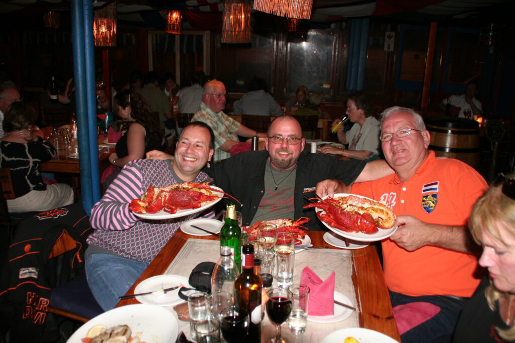 • 2 november 2007: Vanmorgen om 08.00 uur vertrokken naar de Maleise wijk waar de huizen alle kleuren van de regenboog hebben, daarna een wijnproeverij en lunch.Op de terugweg een bezoekje aan de markt en de kerk van bisschop Tutu. Weer terug naar het hotel om ons om te kleden en de motoren op te halen bij Harley Davidson Cape Town. ’s Avonds zijn we op het haven terrein wezen eten in restaurant Panama Jack’s het restauran zag er van buiten niet uit, maar van binnen super gezellig. na de oesters als voorgerecht namen we kreeft (1.3 kilo) als hoofdgerecht. incl. wijn en koffie etc.voor nog geen 50 euro. morgen vroeg om half 7 weer opstaan voor een rit naar kaap de Goede Hoop.
