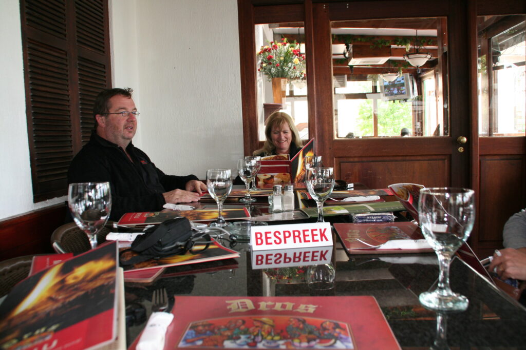 • 3 november 2007: Vanmorgen vertrokken met de regenpakken aan en 14 graden richting Kaap de Goede Hoop daar gewandeld en met het trammetje naar boven, het is inmiddels zonnig met 24 graden. Daarna naar Stellenbosch gereden en onderweg gegeten in een Cubaans restaurant, Ook dit zag er van buiten niet uit maar van binnen prima met heelijk eten. Onderweg naar Stellenbsch nog even gestopt bij een Cheeta farm waar ze proberen om de Cheeta stand in Afrika weer te verhogen. Om 17.00 uur kwaen we aan bij de Rijneveld Country Lodge. ‘sAvonds in Spier bij de Cheeta farm buiten gegeten, wat best frisjes was. Om 23.00 uur weer terug om te gaan slapen om de volgende morgen om half 10 weer verder te gaan.